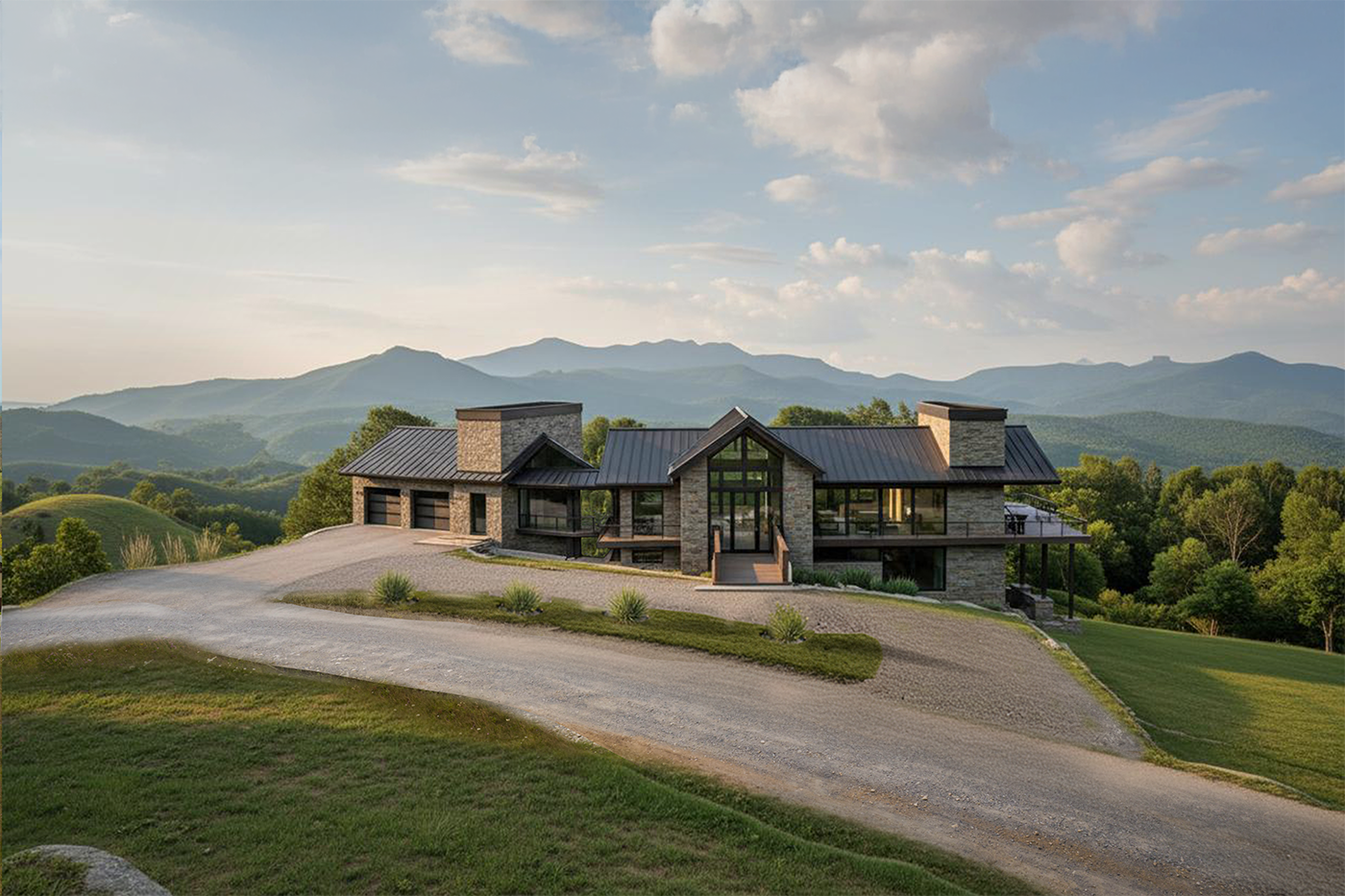 Vertical stone and wood masses reference the towering peaks, while the long horizontal rooflines extend outward, mirroring the sweeping panoramic horizons. The delicate frames and posts recall the rhythm of surrounding trunks and branches, tying the home back to its forested edge.