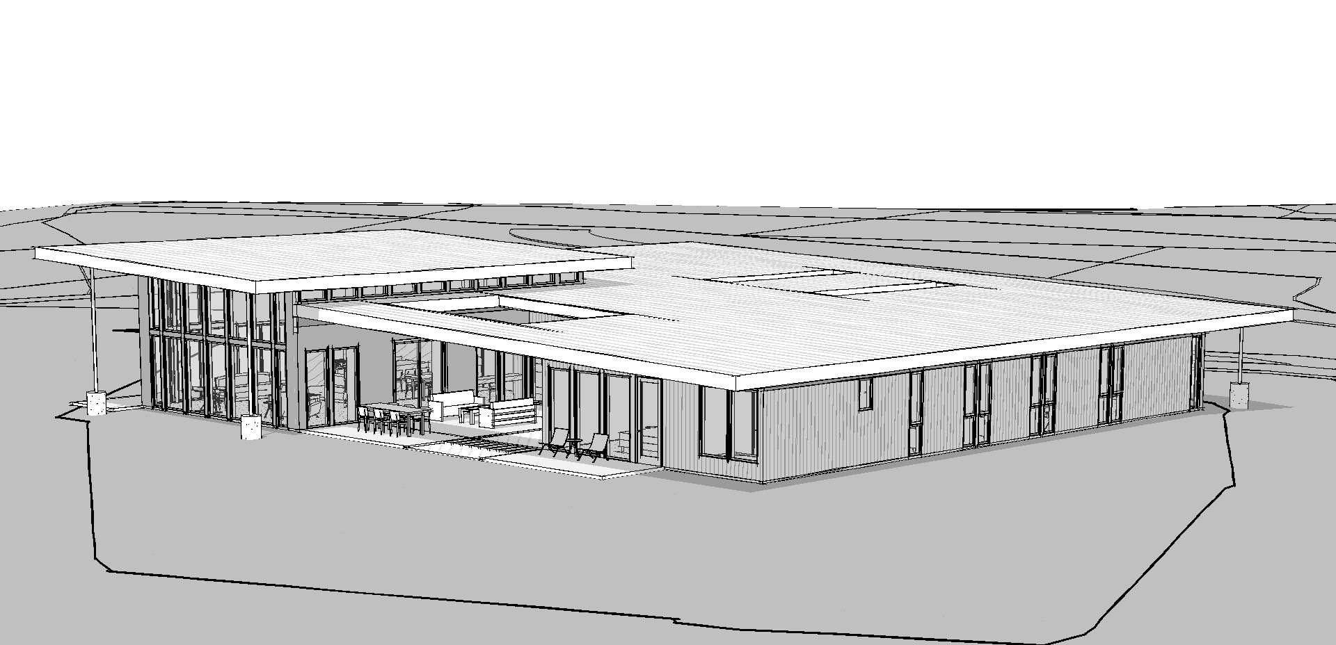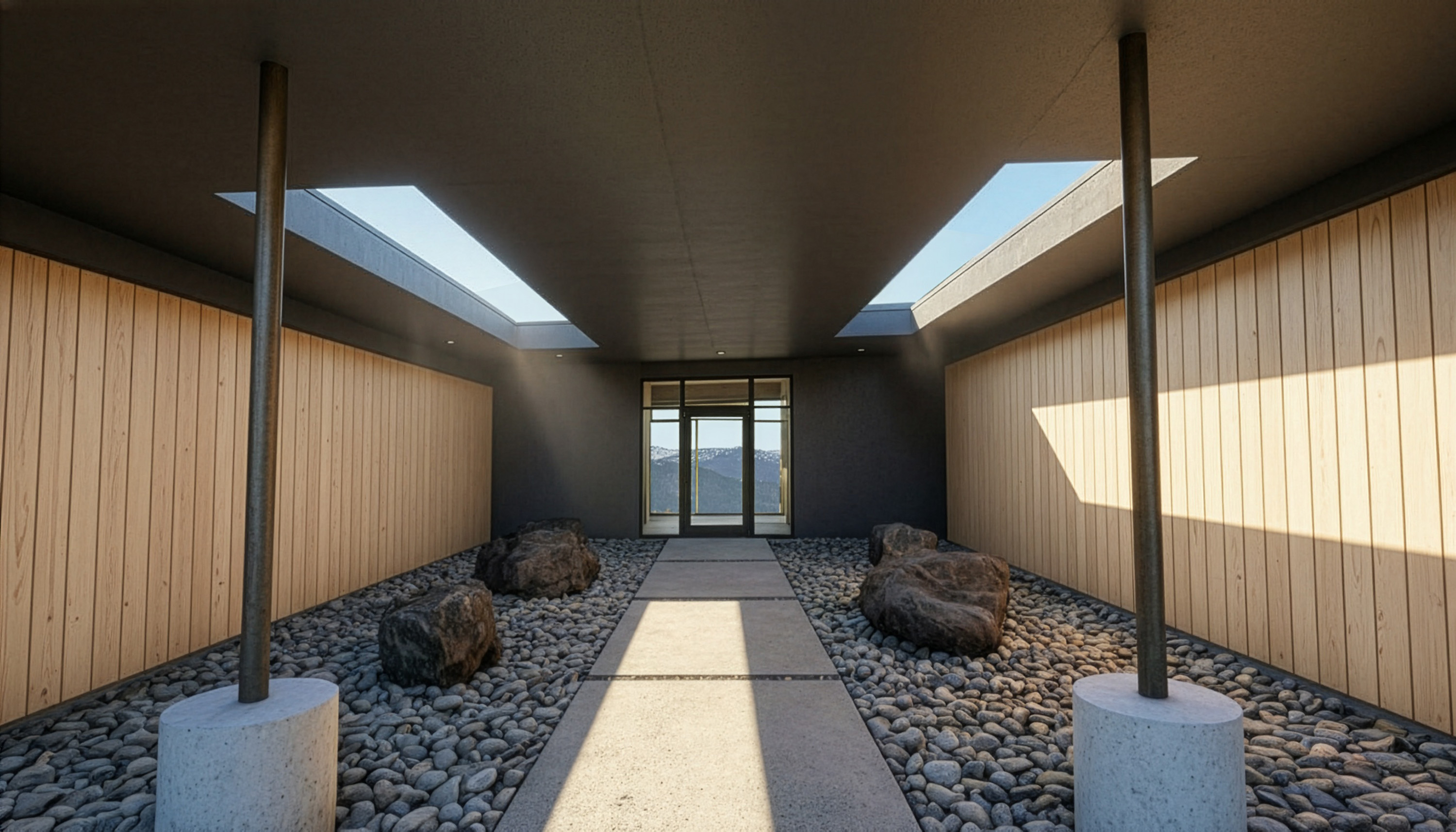 The courtyards are a critical component of the design, allowing for comfortable outdoor living even in a challenging climate. Framed by the building mass and roof overhangs, these spaces deter wind, reduce solar heat gain, and extend daily living outward without sacrificing comfort. This strategy reflects our experience designing custom homes throughout rural and mountain regions of Washington.