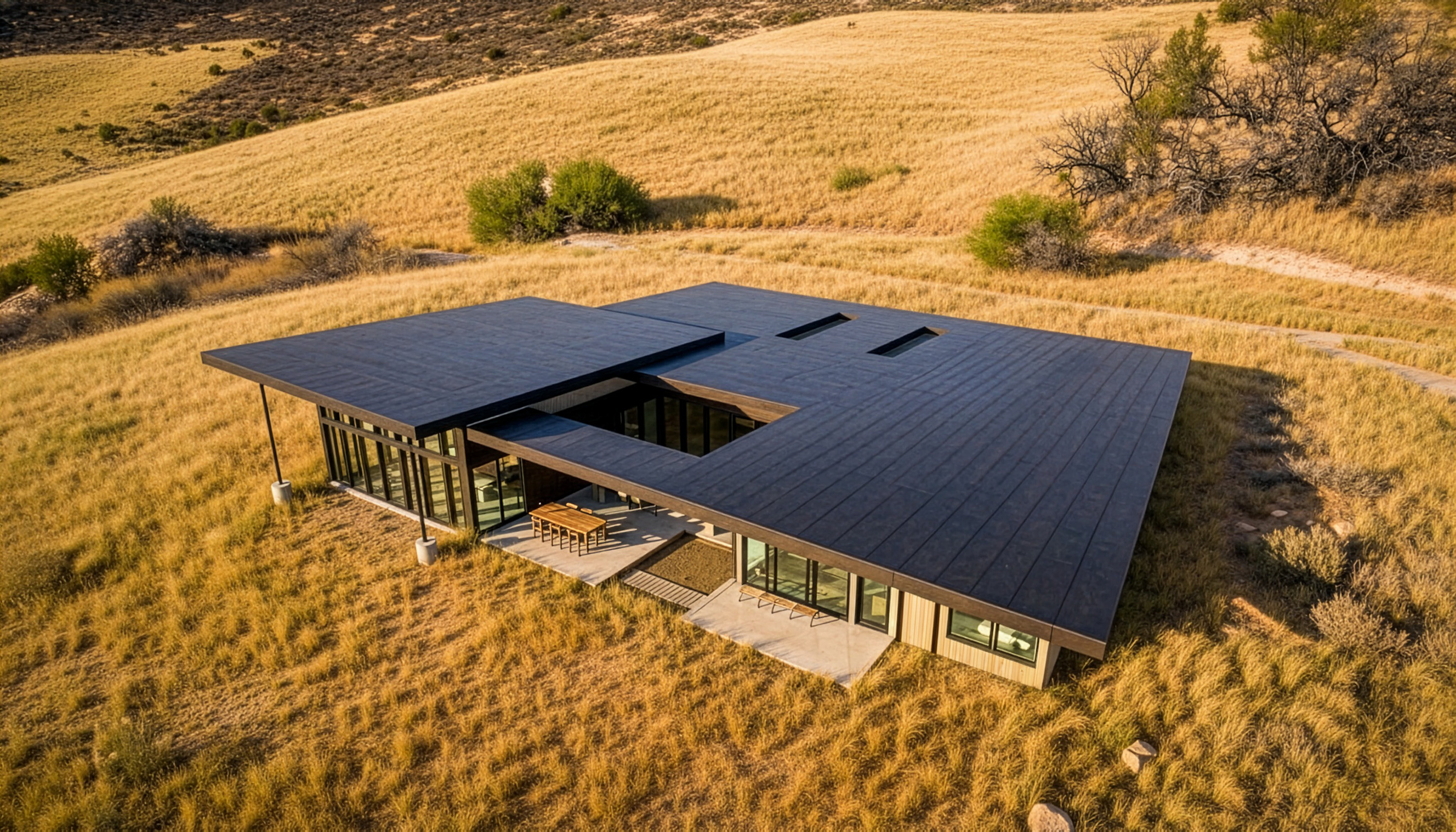 As custom home architects in Washington State, our approach begins with listening to the land. This site offered extraordinary views across the Methow Valley but is also exposed to strong up-valley winds, heavy winter snow, and hot, dry summers. Rather than imposing a singular form, the house is split into two primary wings connected by a central living volume. This H-shaped configuration creates a series of protected courtyards that act as sheltered outdoor rooms, shielding the home from prevailing winds while providing shade during peak summer months.